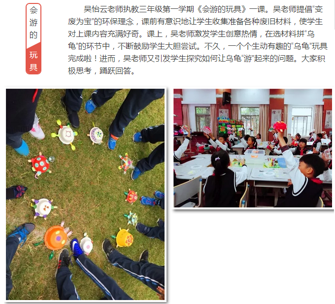 “旋转的风车,游动的乌龟”,这些学生平时喜闻乐见的“小玩具”走进了美术课堂。10月18日上午八点,以“基于标准 把握重点 激发创意 涵养美感”为主题的美术教研活动在徐教院附小开展。由范翊和吴怡云两位青年教师分别执教两节民间工艺课。徐汇区美术教研员夏琛老师及全区美术教师参与了本次教研活动。
