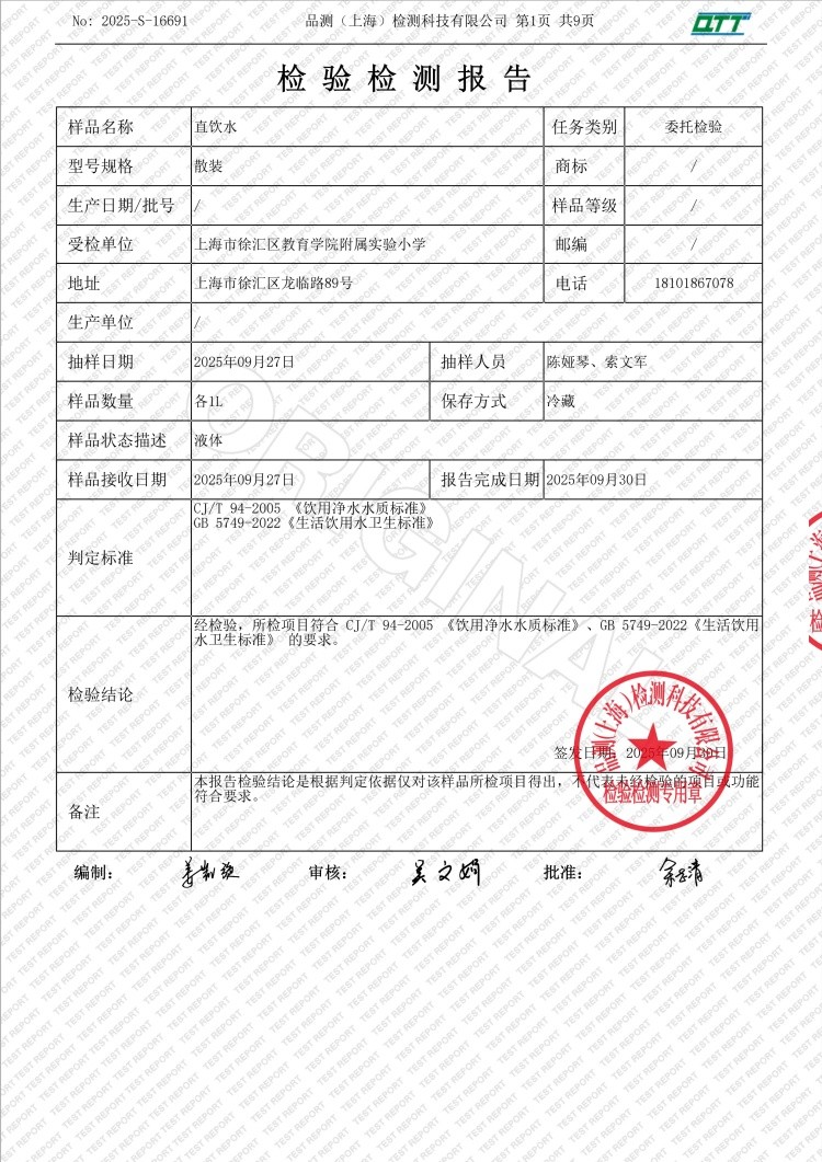 2025学年第一学期徐教院附小直饮水学期检测报告